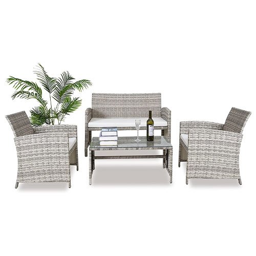 This 4-piece patio furniture set will provide you with an extraordinary comfort experience. The sofa chair has an ergonomic design of wide armrests and curved backrests.